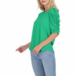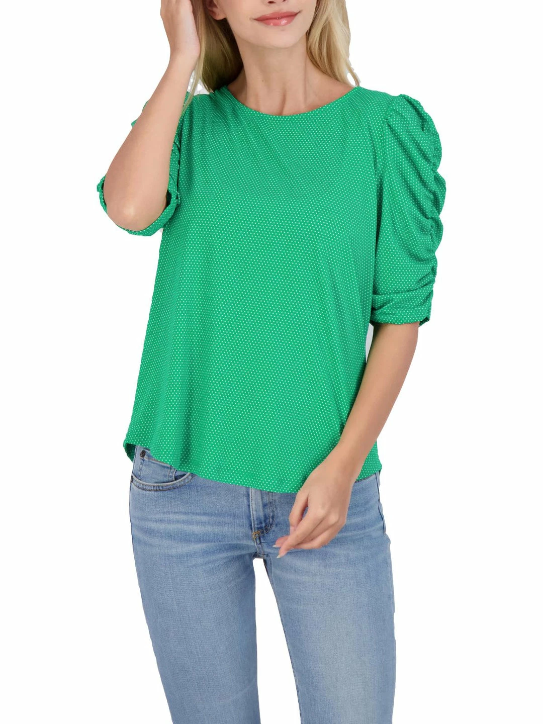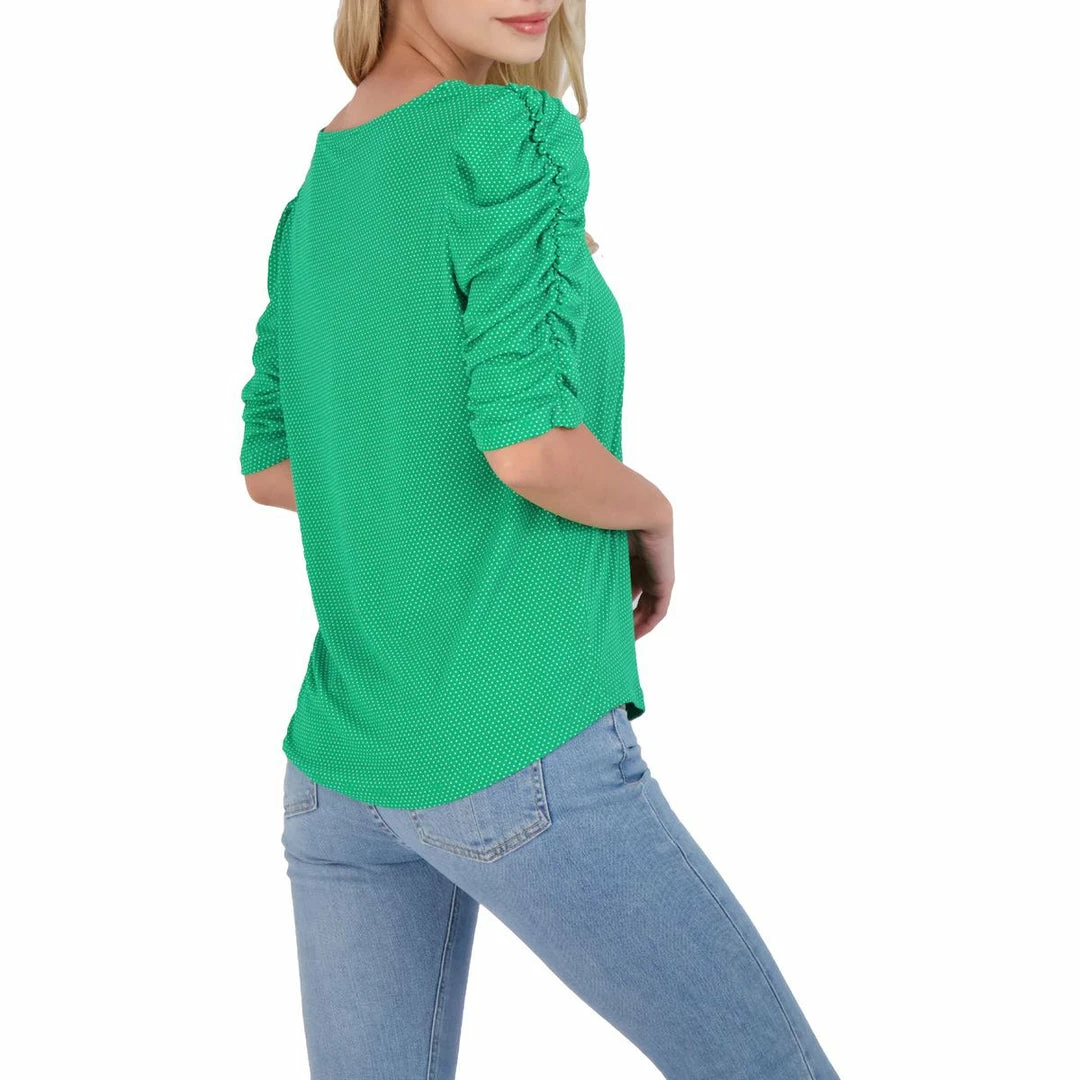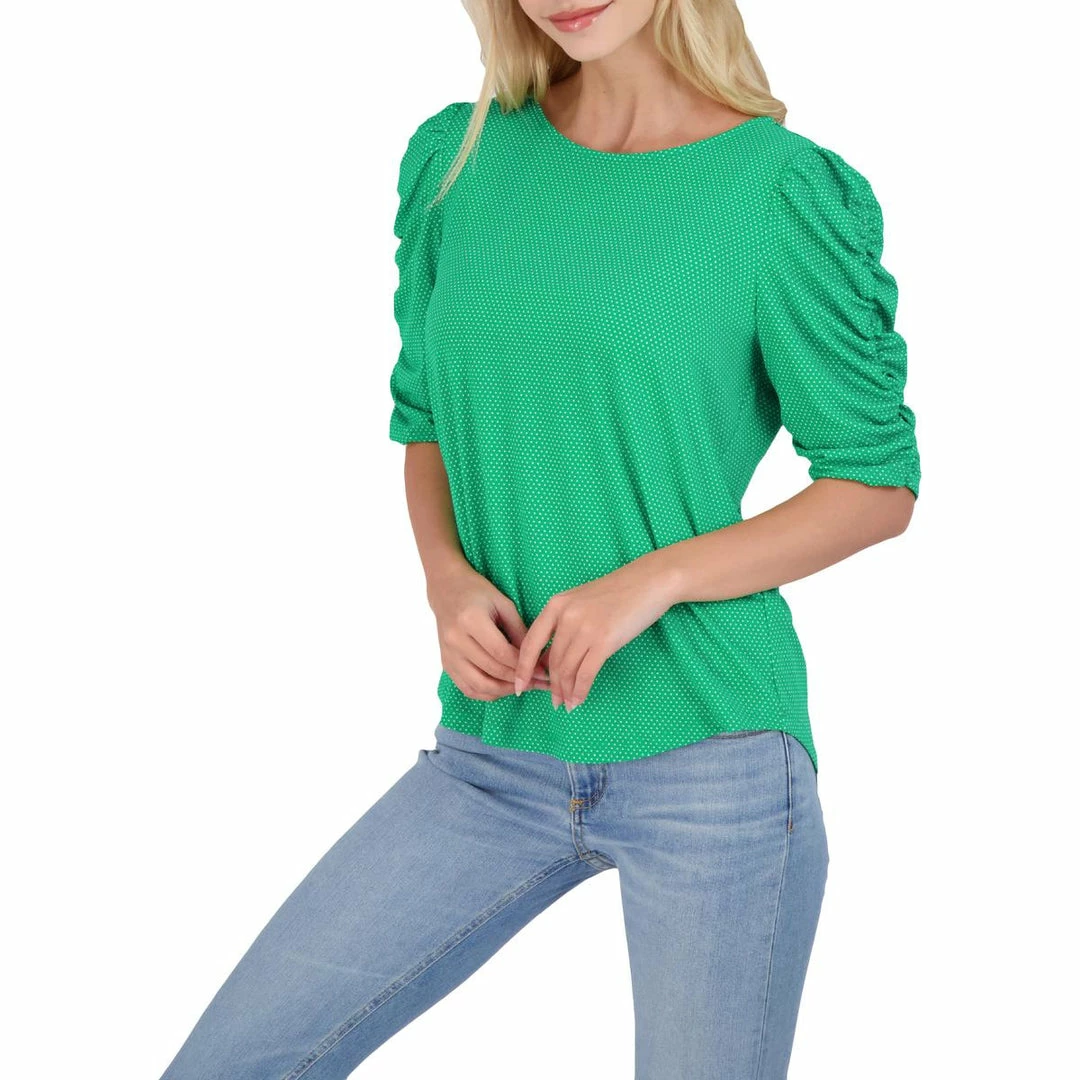 Feel effortlessly romantic in the Caterpillar ruched sleeve blouse by Adrianna Papell. Made with 93% polyester and 7% elastane. This top’s polka dot print and charming ruched sleeves will make this a favorite for your springtime wardrobe. It features elbow length sleeves with semi-fitted construction. Wear it with jeans or shorts. Pull on. This top is guaranteed authentic.