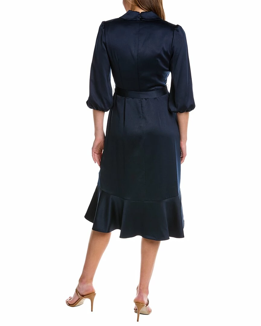 - Design Details – Satin Shawl Lapel, Tie Sash At Waist, 3/4-Length Sleeves, Ruffle Trim