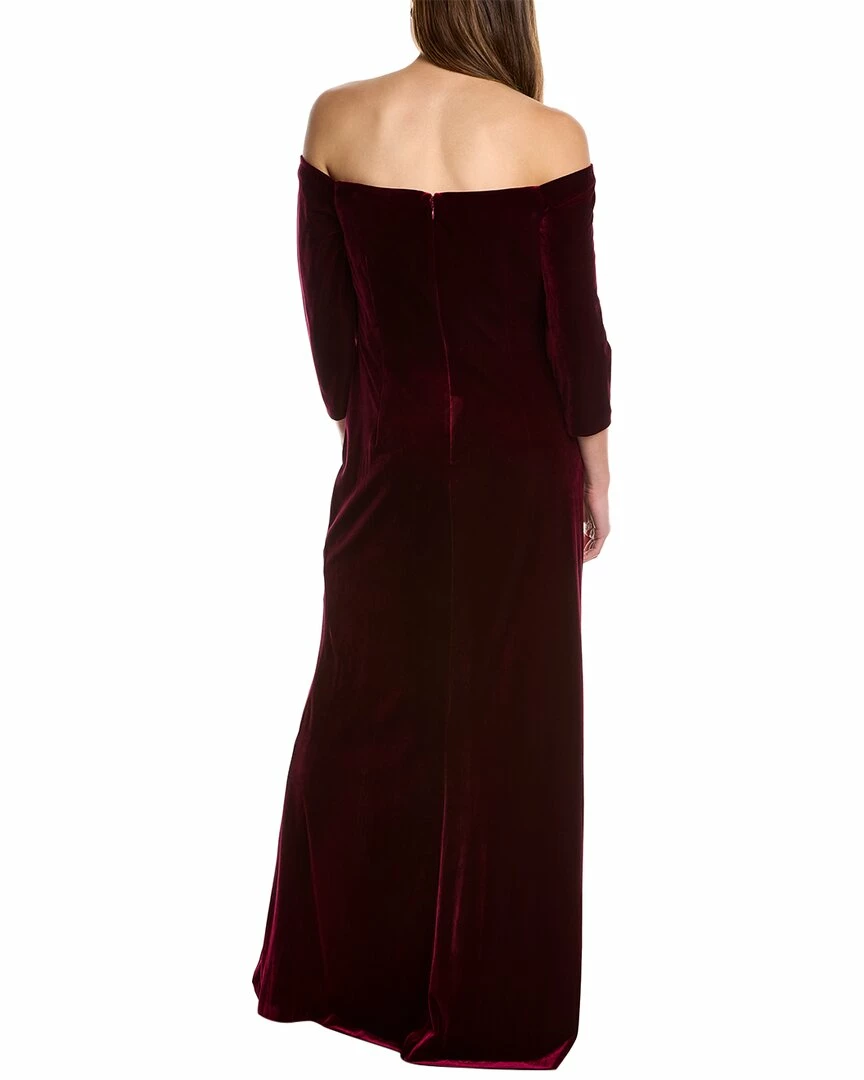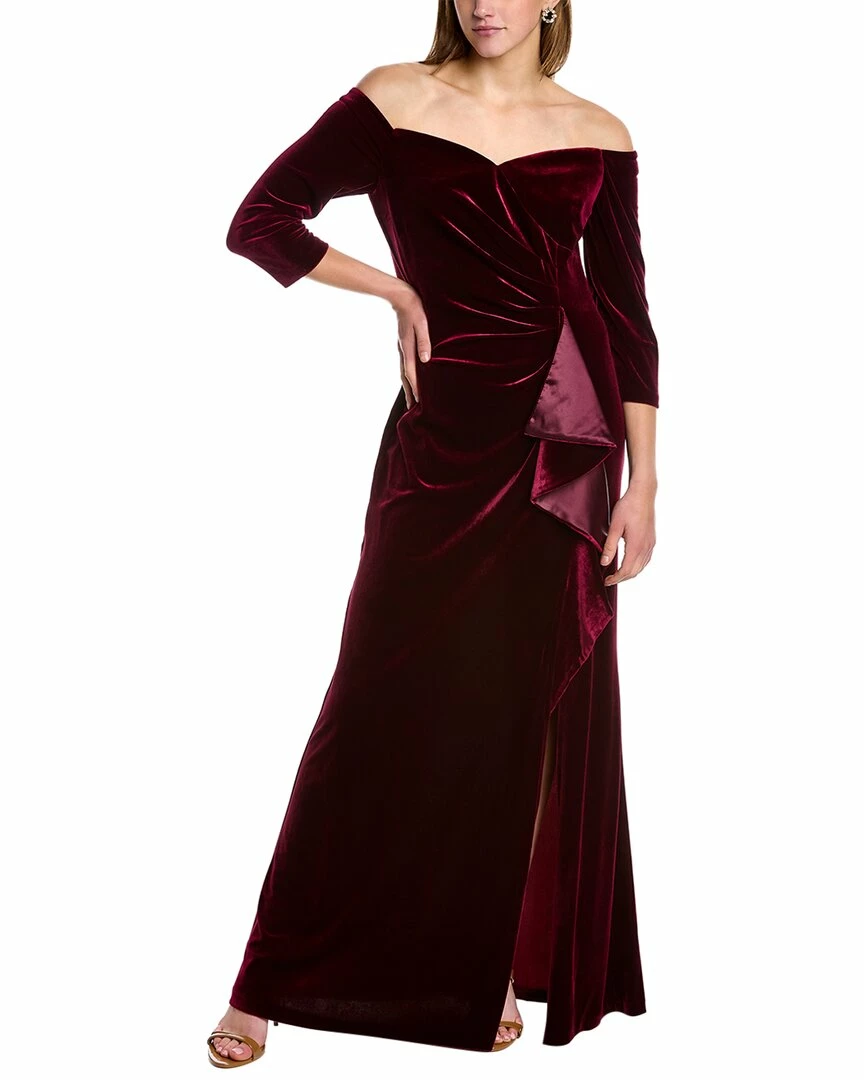 - Design Details – Velvet Off-The-Shoulder Style, Inner Gripping At Neckline, 3/4-Length Sleeves, Pleated Waist, Ruffled Cascade Skirt, And Thigh Slit At Front Left Hem
