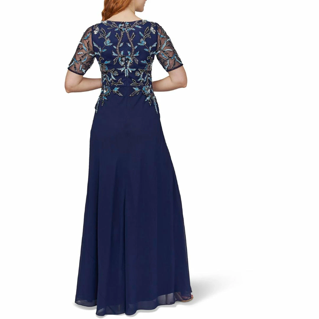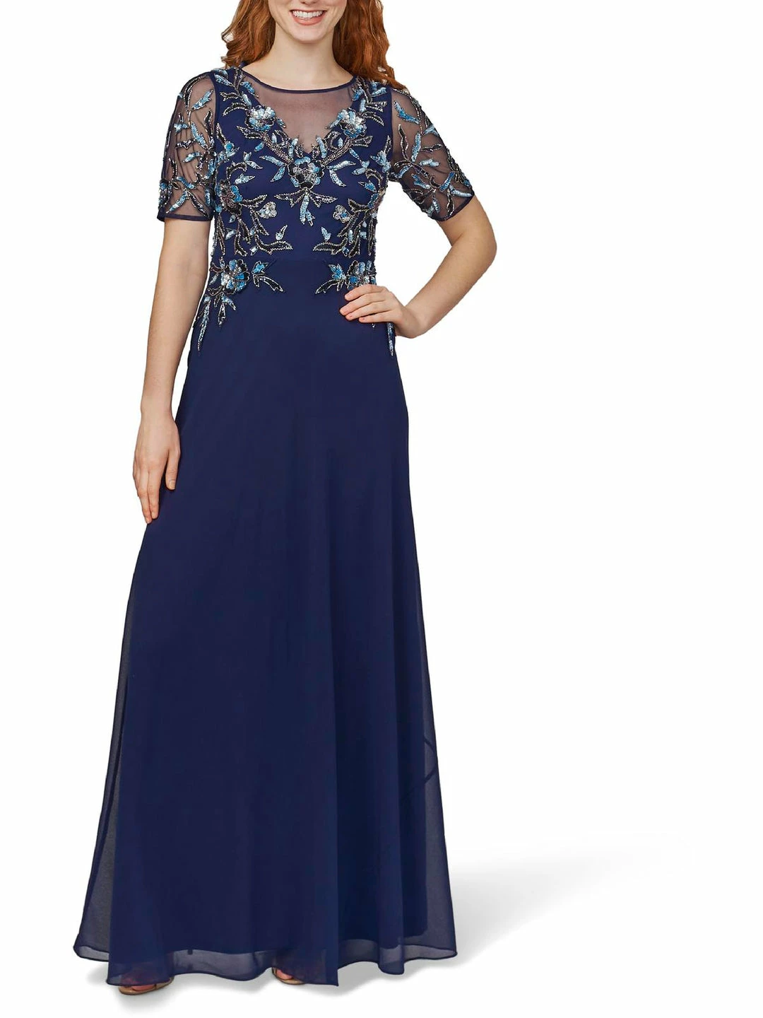 This beaded chiffon gown by Adrianna Papell radiates beauty and class. Made with 100% Polyester, the illusion bodice is adorned with sparkling beads and a crewneck cut. Ethereal chiffon is crafted into an elegant floor sweeping A-Line cut with a zipper closure.