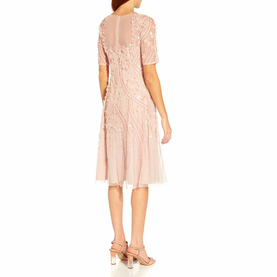 Feel effortlessly romantic in this floral applique cocktail dress by Adrianna Papell. Made with 100% polyester, this dress has a zipper closure and short sleeves with an A-line cut. This dress’s floral applique fabric and mesh illusion neckline will radiate femininity.