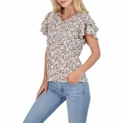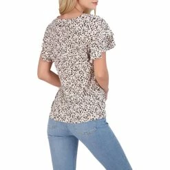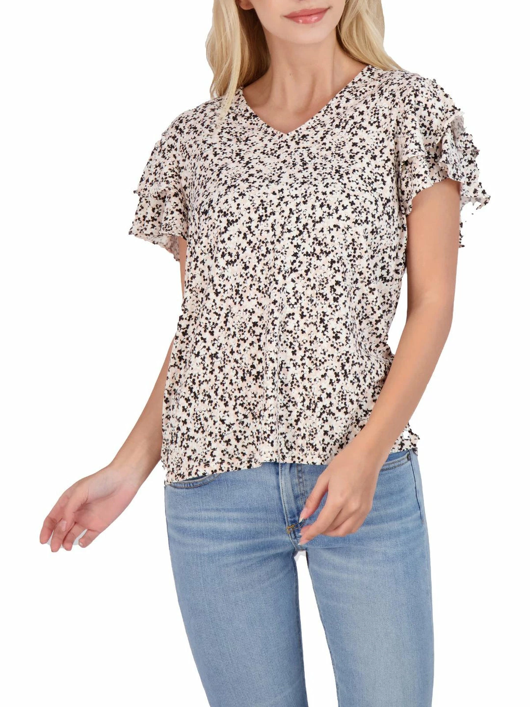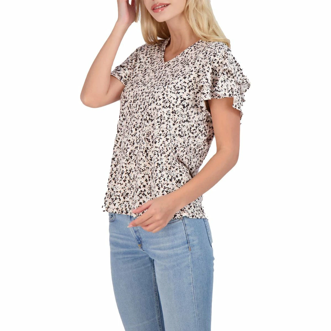 This floral print ruffled blouse by Adrianna Papell will add a feminine touch to any look. Made with a blend of 93% polyester and 7% elastane. This top features ditsy floral print and ruffled details. Flawlessly finished with a V-Neck construction and short sleeves. Pair it with your slim leg slacks for the office or denim for that upcoming coffee date. Pull on. This top is guaranteed authentic.