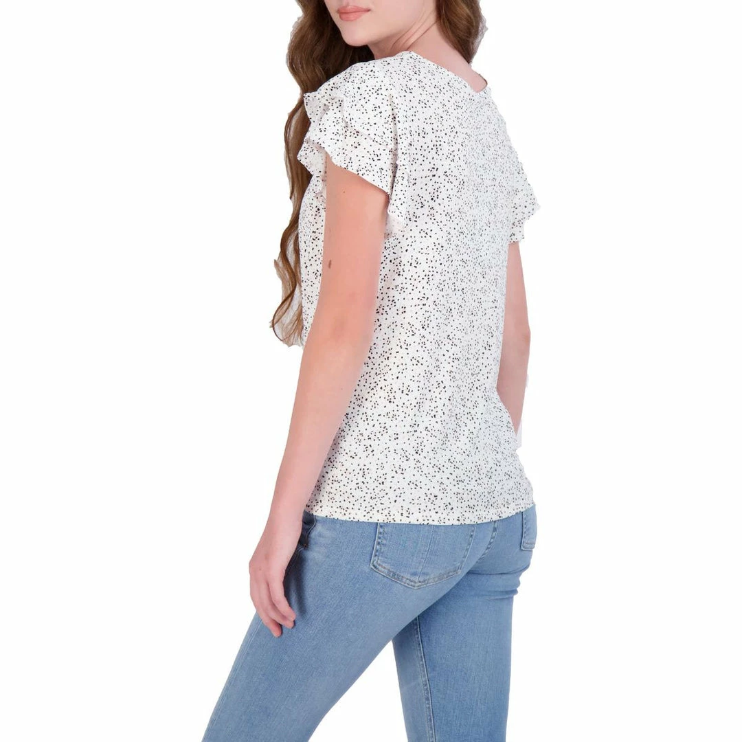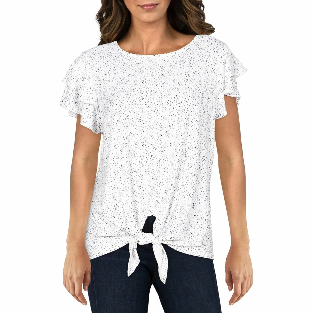 Fluttery details and a feminine print will make this blouse by Adrianna Papell a must have. Made with 95% polyester and 5% elastane. The knot front detail and short flutter sleeves offer graceful, everyday style. It is finished with a semi fitted construction and jewel neckline. Pair it with your favorite denim or shorts. Pull on. This top is guaranteed authentic.