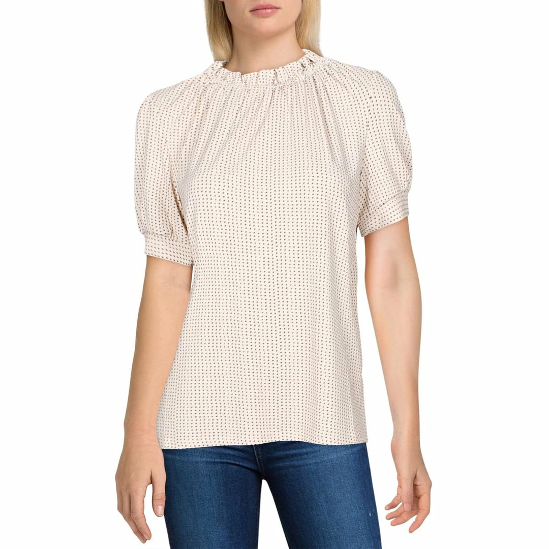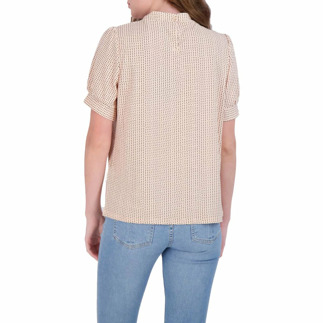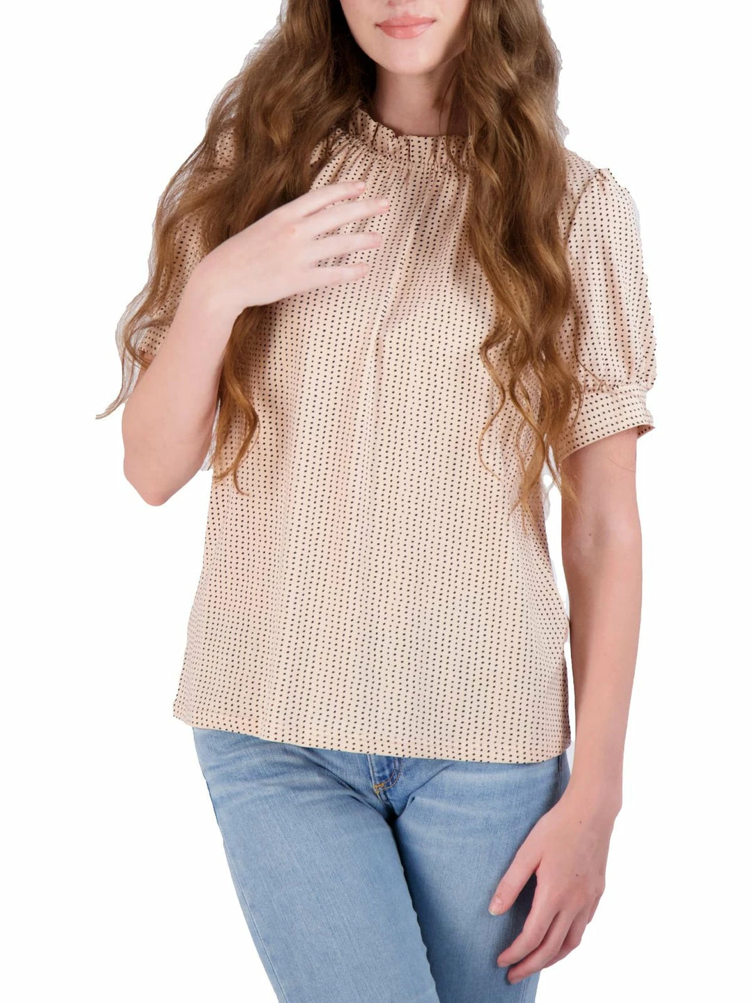 This ruffled dot print blouse by Adrianna Papell offers effortless feminine style. Made with a blend of 93% polyester and 7% elastane. It features short relaxed sleeves, a high mock neck, and dainty ruffles. It’s versatile design will pair perfectly with denim for that date or a skirt for the office. Semi fitted construction. Pull on. This blouse is guaranteed authentic.